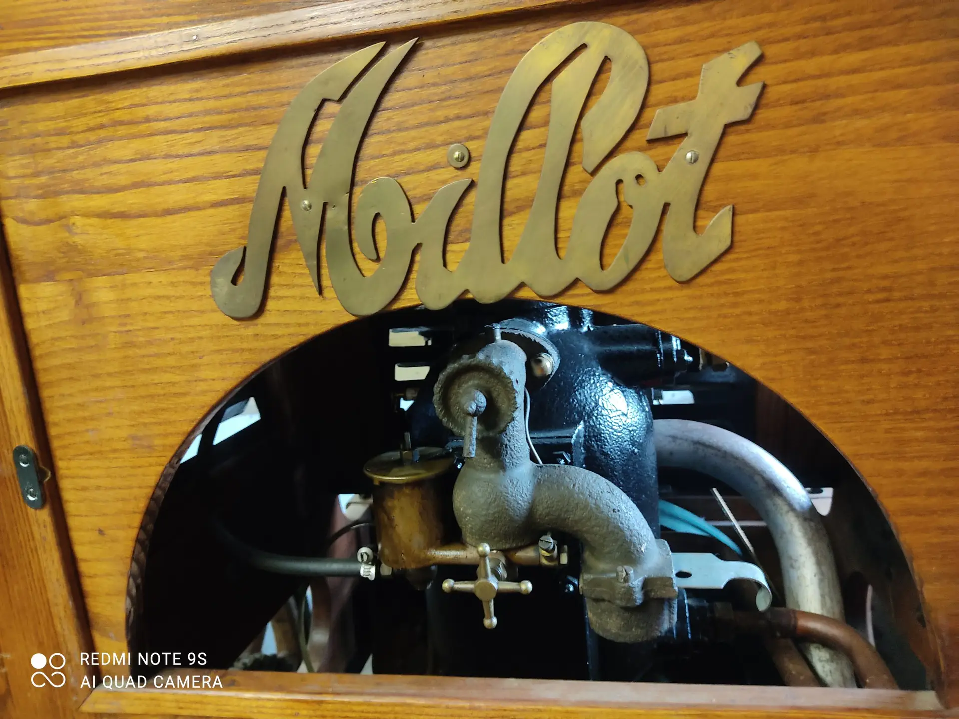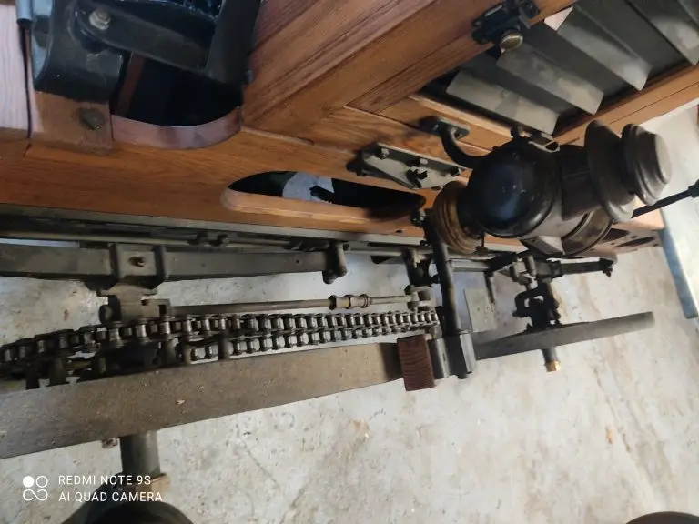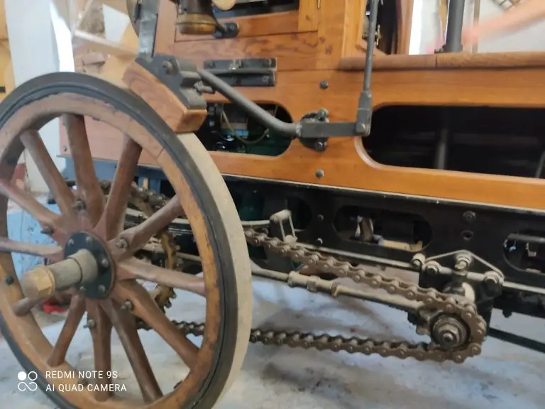 Cette scie automobile est munie de ressorts et de roues en bois. L’essieu avant est articulé à pivots ce qui permets d’évoluer dans un faible espacement.