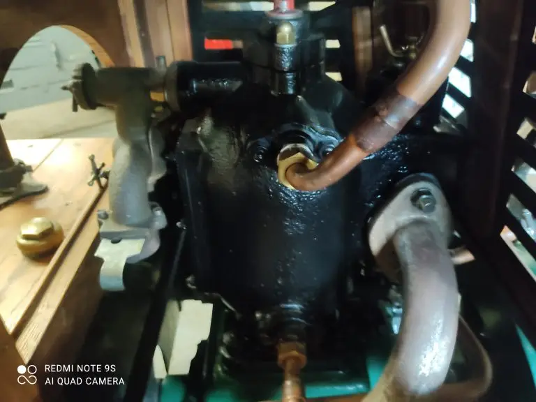 Le moteur est placé à l’arrière bien abrité des poussières. Il commande la scie par l’intermédiaire d’un courroie qui amortit les à-coups inévitables dans les moteurs à explosion et empêche le bris des lames.